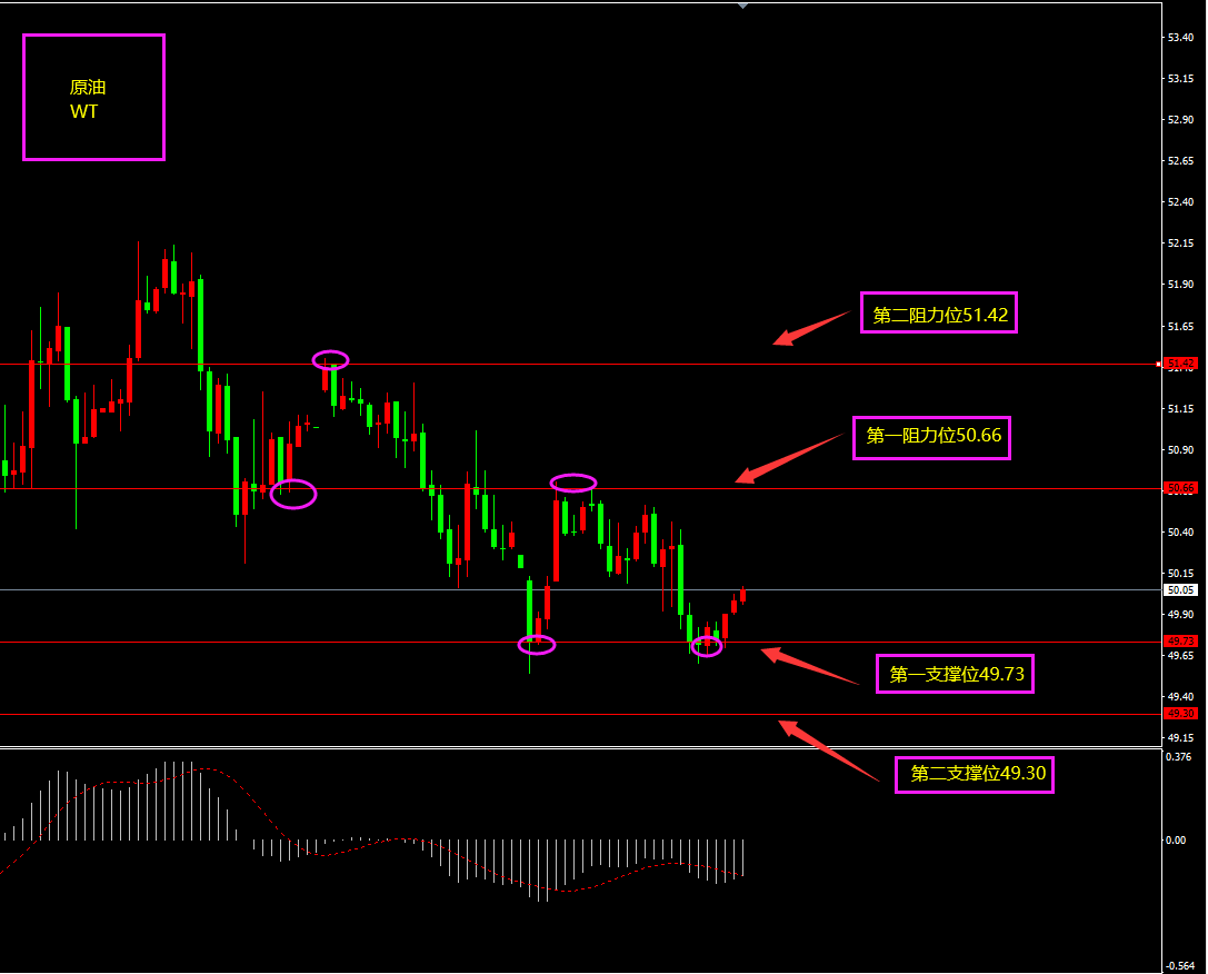 技术点评:天图原油从65跌至50,因全球股市暴跌,市场需求下降,而俄罗斯减产未行动,供过于求。随着近期市场的回暖,需求量将会上升,油价会慢慢上涨,未来看向55?小时图原油期间有连续阴线回落,但未创新低,越往下走,支撑越强,且底部买盘相对较大,原油日内继续以逢低看多为主。