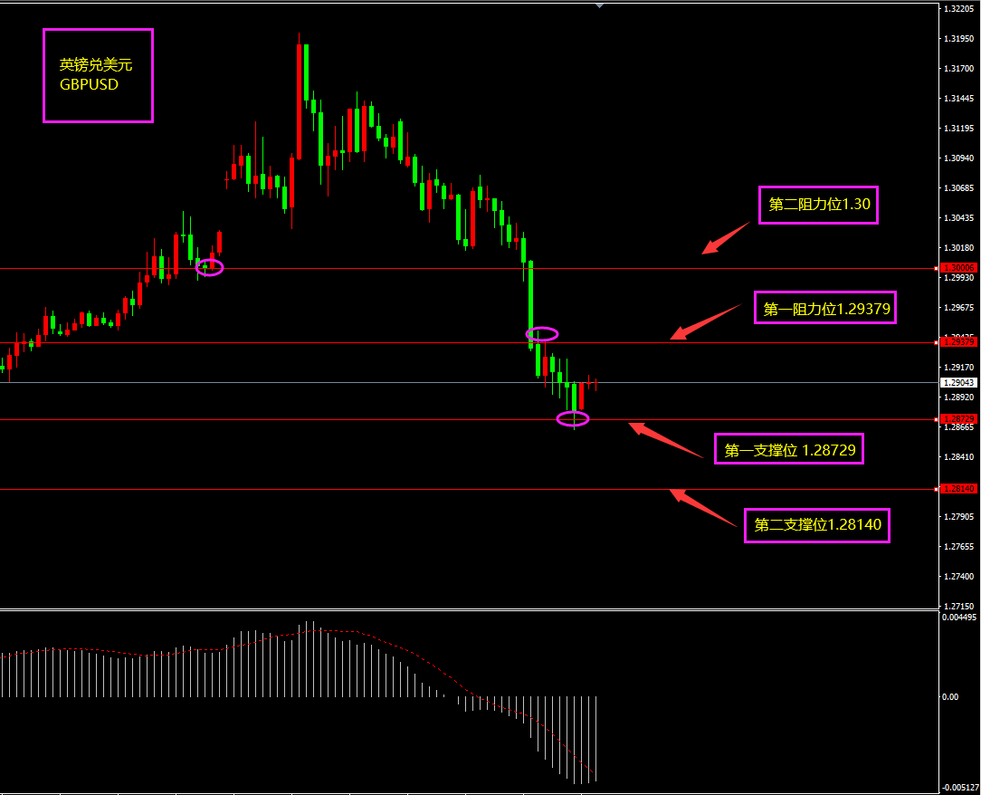 技术点评:天图英镑5连阳之后,走势面临回调,昨日英镑收大阴线,因美指超跌反弹对英镑形成打压,今日有所放缓,日内更多以震荡带有一丝震荡下行为主。小时图英镑期间有连续大阴线下跌,MACD转移至0轴之下,空头为主,目前底部未出现明显大阳线,日内英镑只恐再创新低。