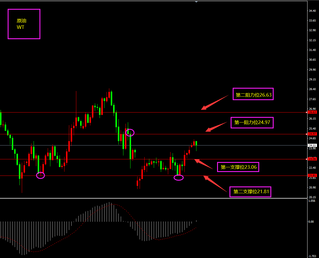 策略分析:第一、二支撑位附近轻仓看多,如有大阴线跌破第二支撑位则转为观望。