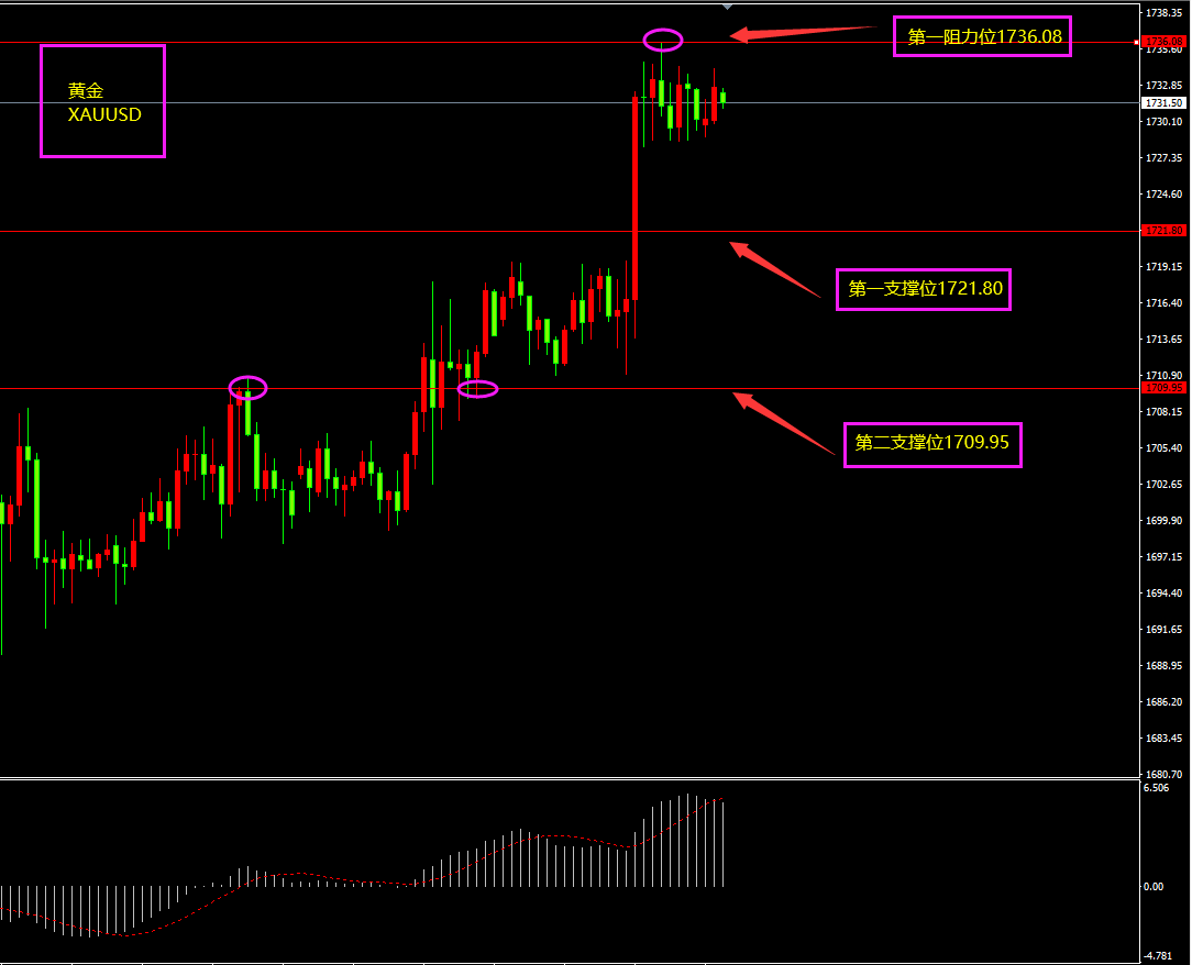 技术点评:原油天图自底部形成底背离之后,后续有大阳线产生,多头为主,短期处在回调阶段,但昨日收大阳线,打破之间平衡,多头再次起势,日内更多以震荡以及震荡上行为主。小时图原油昨日以大阳线突破之前高位震荡,MACD转移至0轴之上,多头为主,日内以逢低看多为主。