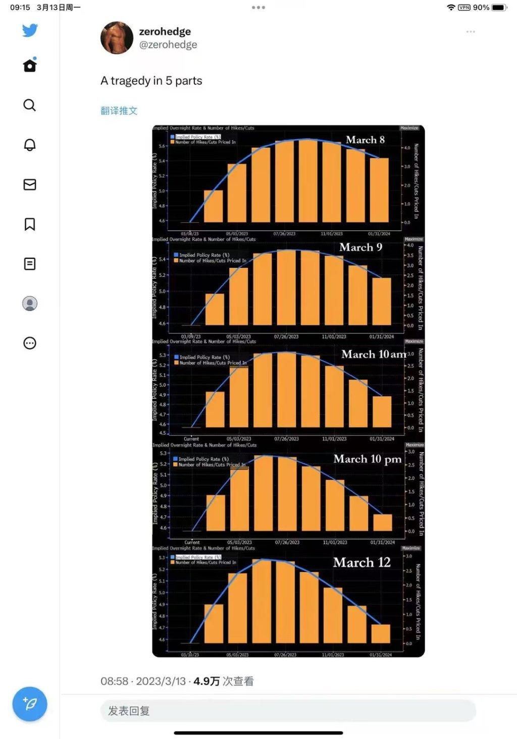 如下图所示,金融博客Zerohedge在社交媒体发文称,这五张图清晰地展示了从3月9日硅谷银行暴雷,再到3月10日倒闭,再到本周末发酵,市场对于美联储的激进加息预期是如何逐步消退的。
